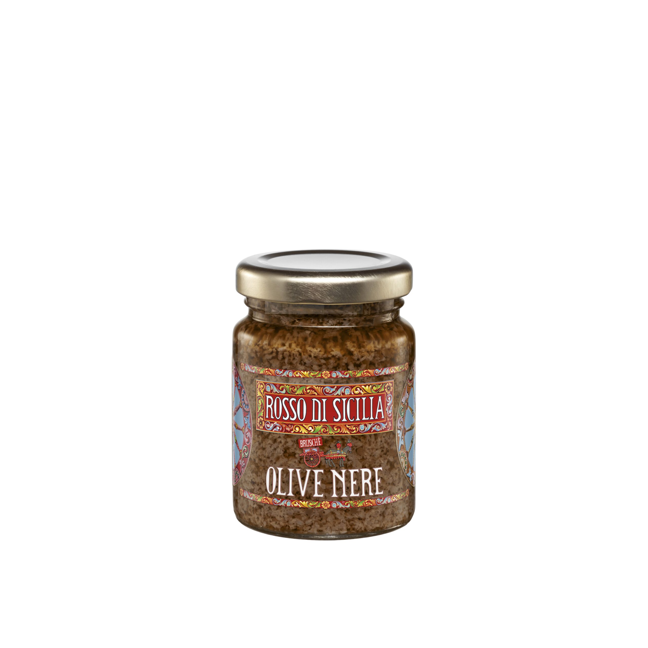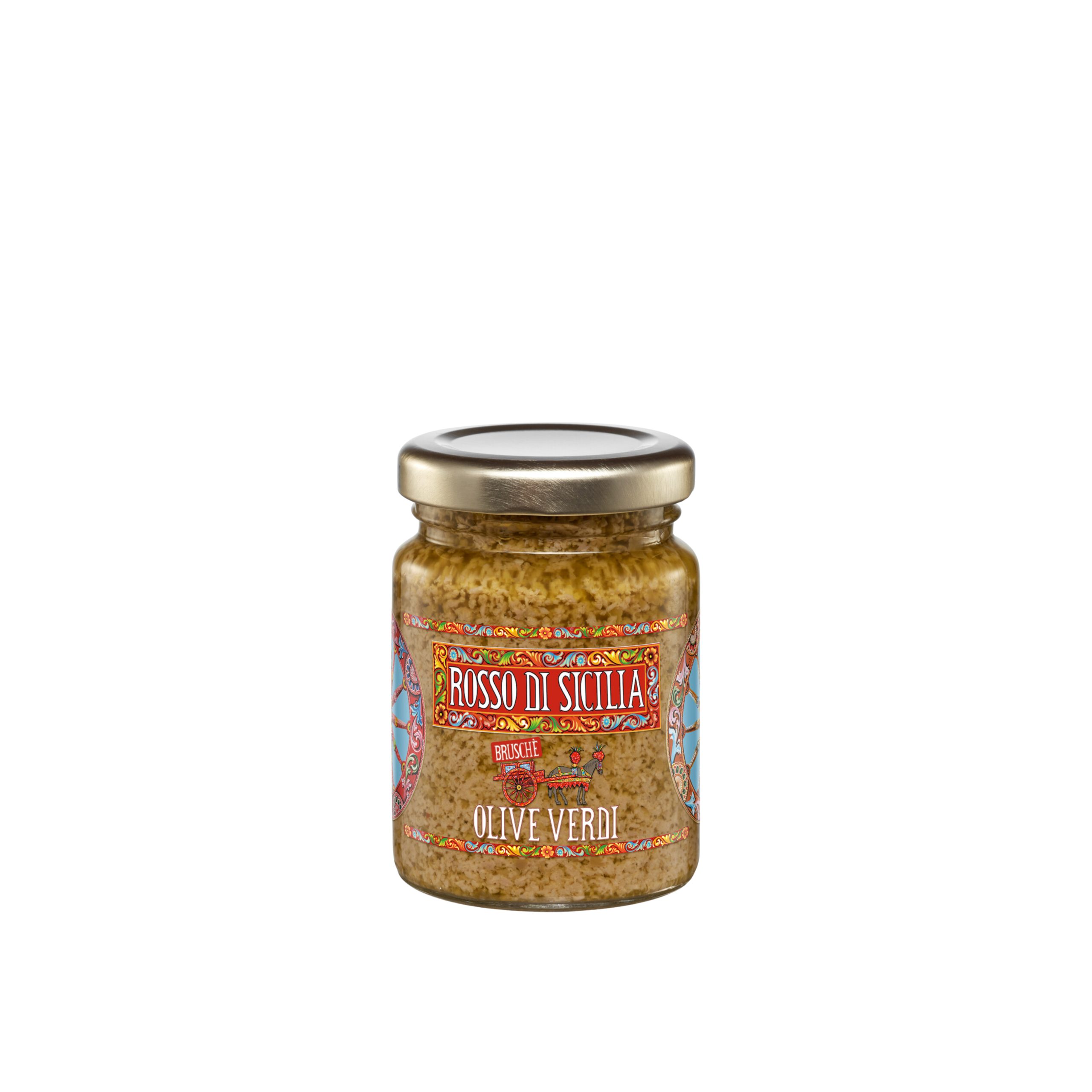 Olive verdi macinate aromatizzate in aceto di vino 80%, olio di semi di girasole, sale, aglio, peperoncino piccante. SENZA GLUTINE, SENZA CONSERVANTI