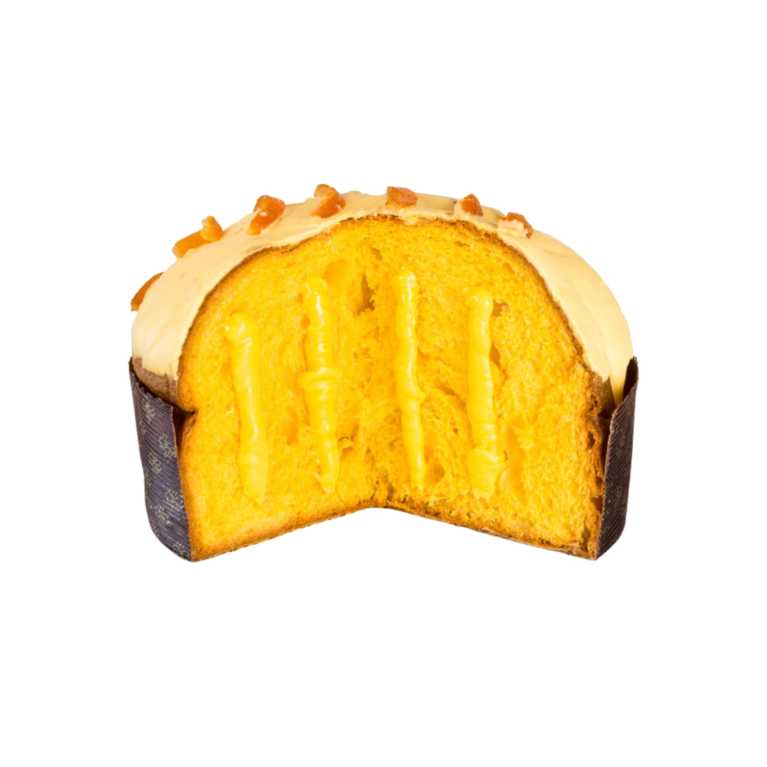 PRODOTTO DOLCIARIO DA FORNO A LIEVITAZIONE NATURALE. INGREDIENTI: Farina di GRANO (GLUTINE), crema di Arancia siciliana 20% (succo di arancia dolce siciliane 50%, saccarosio, fruttosio, gellificante: pectina, amido di mais, olio essenziale di arancia dolce Sicilia), BURRO (LATTE), zucchero, tuorlo d’UOVO, glassa [cioccolato bianco (zucchero, burro di cacao, LATTE intero in polvere, emulsionante: lecitina di , aroma naturale vaniglia), aroma naturale arancia], LIEVITO naturale (FRUMENTO), emulsionante: mono- e di- gliceridi degli acidi grassi, miele, LATTEscremato in polvere, sale, aromi naturali, E160a (ii): betacarotene (betacarotene naturale, acqua, glicerina, emulsionanti, vit. E). Decorato con: scorze di arancia candita (scorze di arancia, zucchero, sciroppo di glucosio).