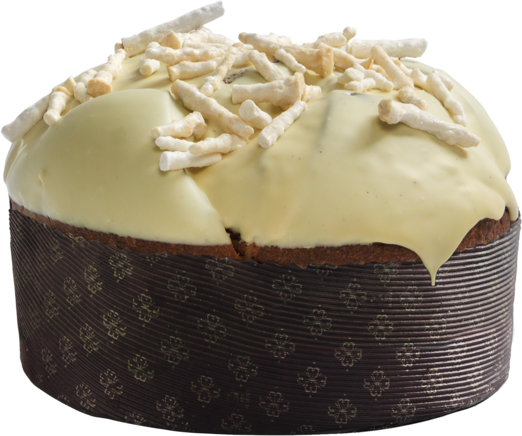 Panettone artigianale con crema di manna da spalmare ricoperto di glassa bianca e colata di mannetti, confezionato a mano.
